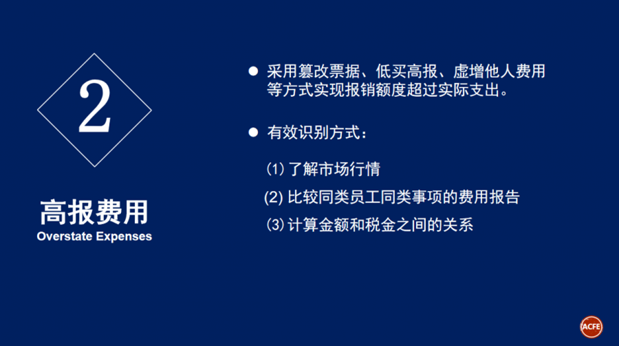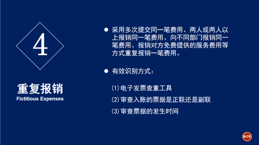 4月23日,亚太企业差旅费控数字化峰会在北京成功举办! 峰会吸引了200余名企业总裁、经理等高级别负责人前来参加;会议围绕“企业差旅费控数字化转型”这一主题开展了十余场精彩纷呈的演讲。 ACFEChina作为此次活动主办方之一参加活动。 同时ACFE 北京分会会长胡玉华(Helen Hu)女士受邀出席本次峰会并发表演讲。 胡会长演讲主题为《费用报销舞弊的识别与防范》,演讲主要内容有: 1. 2020 ACFE Report to the Nations; 2. 费用报销舞弊常见类型与识别; 3. 费用报销舞弊的几点建议。 首先,胡会长为大家分析了《ACFE2020年全球舞弊调查报告》的几个关键点: 图一:本次调查报告基于来自125个国家的2,504份调查报告,其中舞弊案例涉及的直接经济损失超过36亿美元。 图二:ACFE预计,舞弊为包括政府和企业在内的各类组织带来的经济损失约为全年总收入的5%,这个百分比和2018年报告中预测百分比持平。各类案件损失中位值为125,000美元,所涉及案件的平均损失为1,509,000美元。 图三: 挪用资产行为发生率最高(86%的案件涉及),带来损失金额最低(损失中位数100,000美元); 财务报告造假相比发生率最低(10%的案件涉及),但是造成的经济损失最高(损失中位数为954,000美元)。 用一系列报告数据表明舞弊对企业严重的危害性,以及企业进行反舞弊工作的必要性。 图一 图二 图三 接着,胡会长为我们详细介绍了费用报销舞弊常见类型以及如何识别报销舞弊: 1. 公报私费 2. 高报费用 3. 捏造费用 4. 重复报销 最后,关于如何防范费用报销舞弊胡会长给出我们以下建议: 1. 详细的费用报告(时间、地点、金额、事由、参加人等) 2. 尽量要求费用报销的原始收据 3. 要求员工的直接主管批准费用报销 4. 定期抽查与客户相关的费用报告 5. 规定费用必须在一定期限内提交 6. 规范费用管控,可以采取统一采购 7. 职责分离(审批、登记、支付) 8. 加强内部控制,制定定期和专项审计制度 9. 设定“顶层”基调,舞弊零容忍,高调反舞弊 10. 始终保持“专业怀疑度”